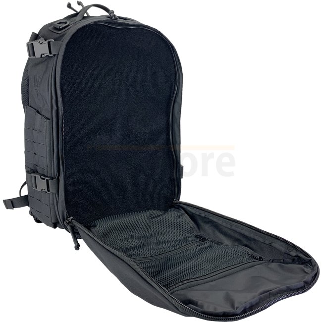 The thick spacer mesh back padding’s centered ventilation channel ensures positive air flow and weight distribution on your back. Behind the back’s stiffener and removable aluminum rod a padded compartment for either a hydration system or a laptop can be found. The wide top zipper allows for inserting laptops of 15 inch hassle-free and since the bottom of the backpack has an integrated foam padding the laptop won’t take hits when lowering it to the ground or when lifting it onto a conveyor band. Alternatively, the compartment can also be used to insert a soft armor panel.