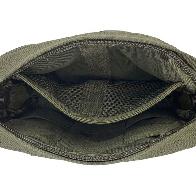 The Horizontal Utility Pouch Small comes with a MOLLE system surface as well as two Velcro strips for patches. On the inside there are two rows of elastic loops and a mesh pocket on the other, which can be vertically divided by means of Velcro. This can safely store a whole lot of accessories.