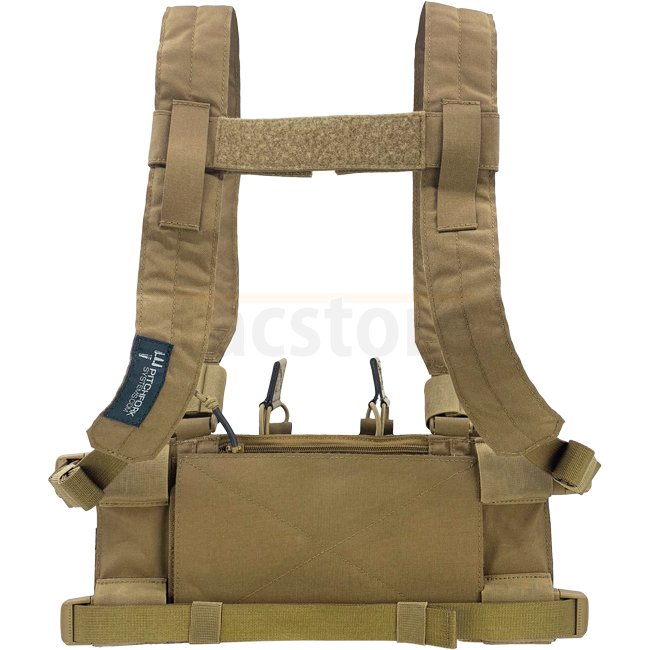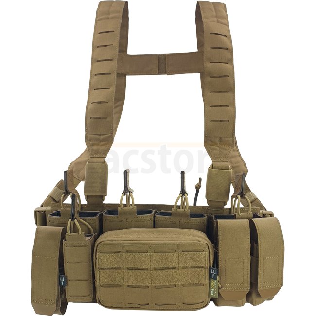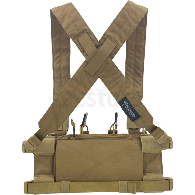 The Pitchfork MCR Modular Chest Rig - Coyote is a versatile MOLLE system-based Chest Rig set complete with various pouches and adjustable shoulder/hip straps.