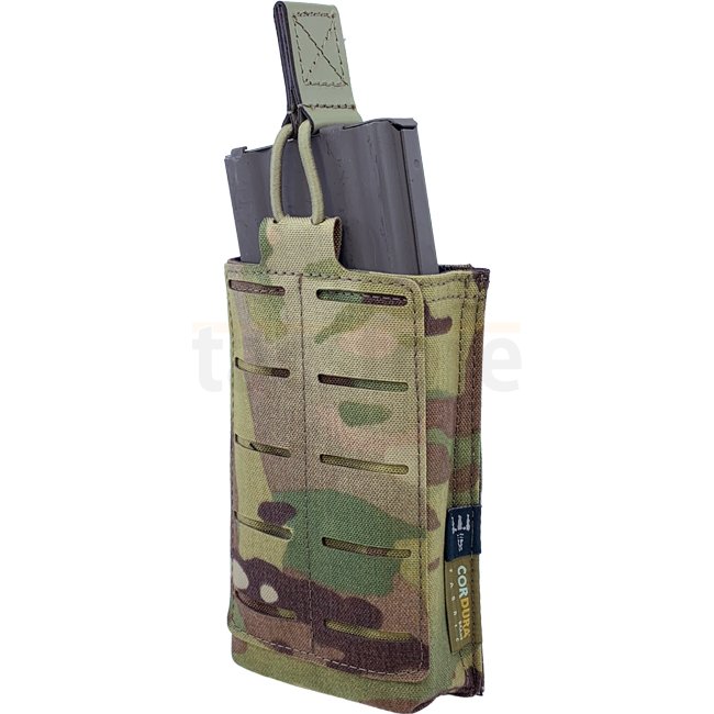 The Open Single Rifle Magazine Pouch can hold all common 5.56 / .223 rifle magazines, even SIG and AK47/74 magazines fit perfectly (G36 magazines do not fit). The highly resistant and slightly elastic Hypalon pull tab is adjustable in length. For a better grip, the inside of the pouch is lined with an anti-slip material. The front has a MOLLE system-based LaserCut surface, which can be used to mount additional pouches.