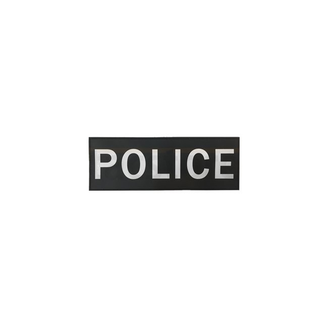 White on black Pitchfork Police Patch - Small, 30 x 90 mm, Rubber, Velcro back.