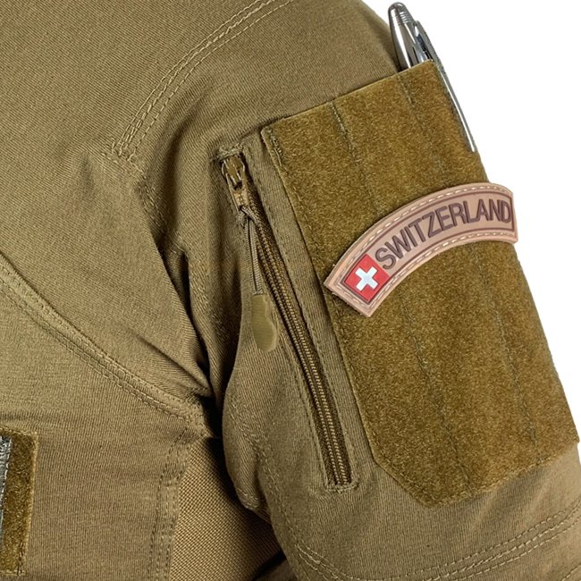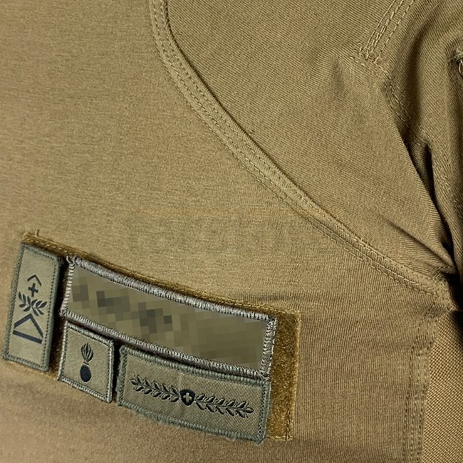 On the sides and under the arms, it has a light, soft and breathable mesh, which provides the necessary cooling in hot situations. Also on the sides pouches can be found for a smartphone or other flat objects. Cable bushings allow concealed routing of headphones or other cables. The integrated pockets on the upper arms with YKK zippers also have cable entries on both sides. Velcro on the arms and on the chest makes it possible to apply name patches, rank insignia and others.