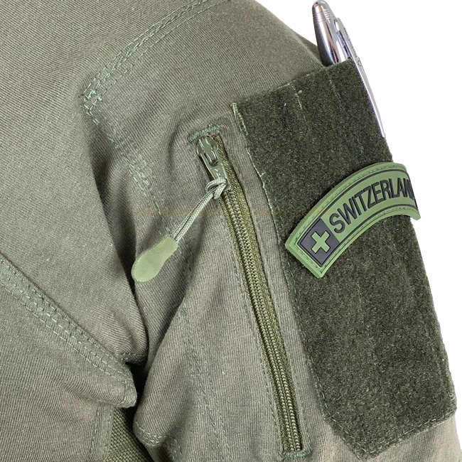 On the sides and under the arms, it has a light, soft and breathable mesh, which provides the necessary cooling in hot situations. Also on the sides pouches can be found for a smartphone or other flat objects. Cable bushings allow concealed routing of headphones or other cables. The integrated pockets on the upper arms with YKK zippers also have cable entries on both sides. Velcro on the arms and on the chest makes it possible to apply name patches, rank insignia and others.