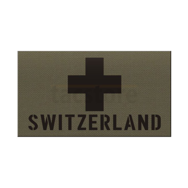Pitchfork Switzerland IR Print Patch in Ranger Green. Front: IR foil, printed. Back: Hook surface. Dimensions: 90 x 50 mm.