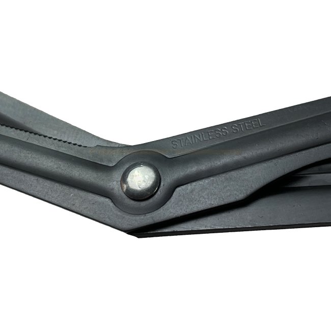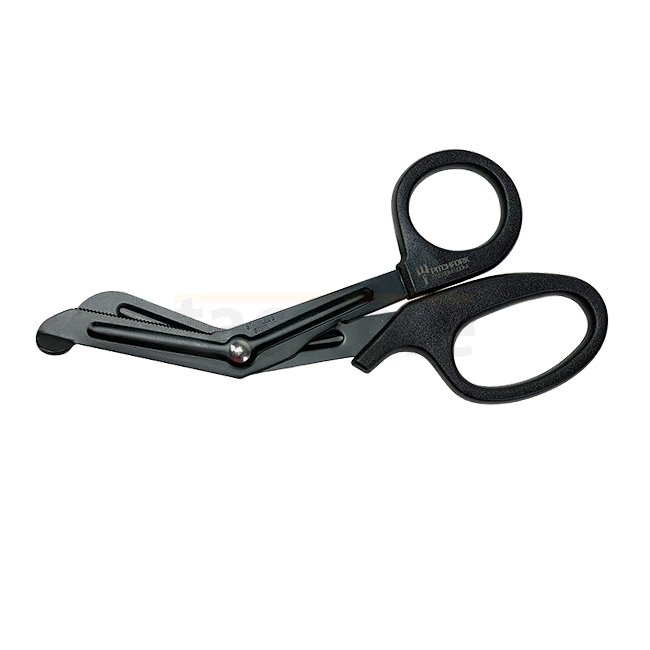 The Pitchfork Trauma Shear 15cm - Black is a durable stainless steel medical tool with a black anti-gloss finish. It features deep mill serrations for quick cutting, sharp enough for thick clothing, a blunted tip for safety, large non-slip handles, and au