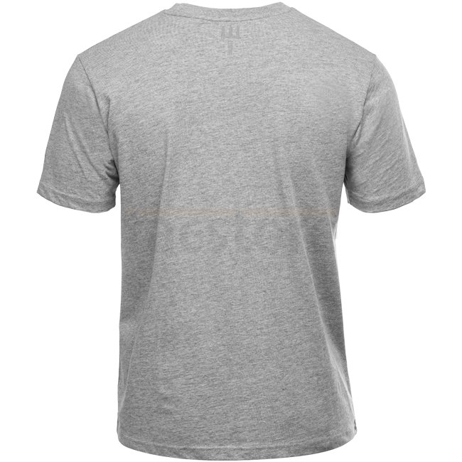 Pitchfork Trident Print T-Shirt in heather grey, size M. Large trident centered at chest, small trident at the back neck area. Semi-tight cut for a good fit, made from 50/30 cotton-polyester blend. Comfortable, functional design.