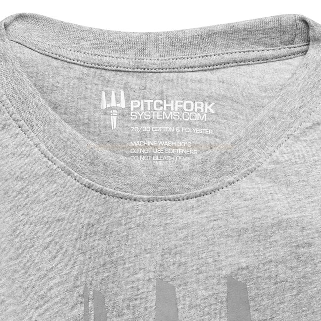 A stylish Pitchfork Trident Print T-Shirt in Heather Grey, size S. Large trident on the chest, small trident on the back. Medium-weight cotton-polyester blend for comfort, semi-tight cut for a good fit. Functional and simple design.