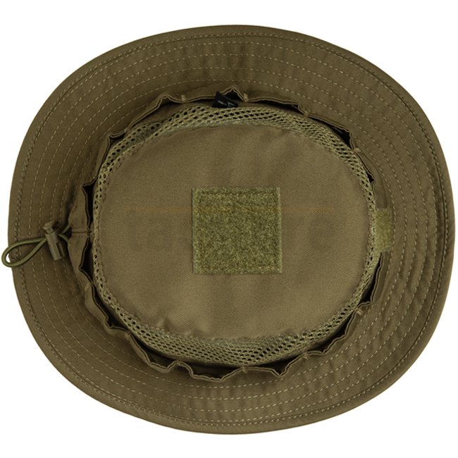 While maintaining the classic boonie hat shape, the crown is kept flat for a low profile. A mesh fabric is used all around the hat, which enables maximum air circulation. On the upper area a 50 x 50mm loop surface can be found to attach an IR reflective patch. Around the hat we used the same polyester-cotton material instead of stiff webbing ensuring an all-around low IR signature. Hidden underneath the circumference a shock cord is sewn in that allows infinitely variable size adjustment for a perfect fit, keeping the selected size by a cord stopper in the back. The brim is kept extra narrow. All other features found on standard models like the chin strap or a neck cover have been left away. Functionality thru simplicity.