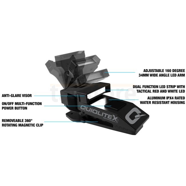 New Aluminum Housing, USB Rechargeable, 4 modes, Anti-Reflective Anodize Finish, 160° Adjustable LED Arm, Magnetic Housing, QuiqClip, 20 Min Auto-Off Timer, QuiqFlare Attachment, IPX4 Water Resistant, Warranty. Set contains: QuiqLiteX2, Magnetic QuiqClip,