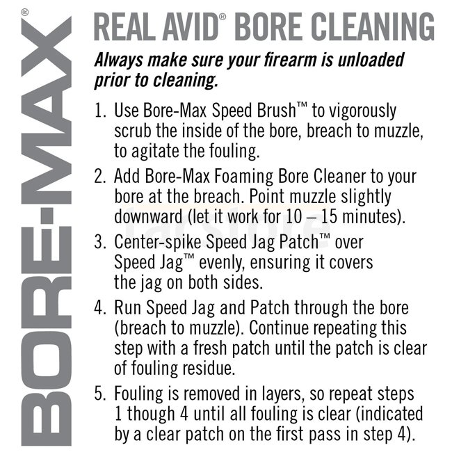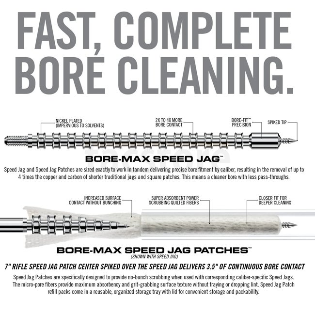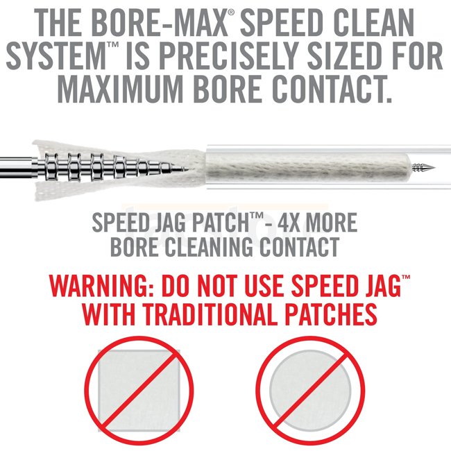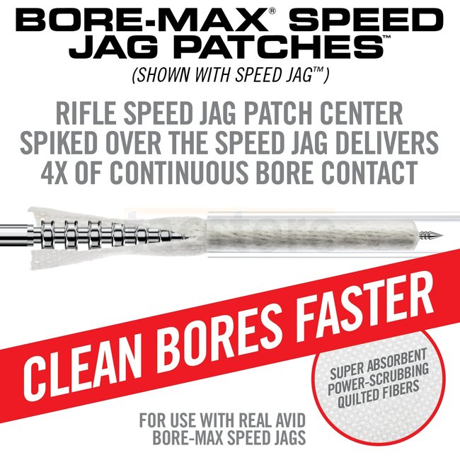 Bore-Max Speed Jag Patches are a component of the Bore-Max Speed Clean System for faster and easier bore cleaning. Sized to account precisely for both the jag diameter and patch thickness, this combo provides the optimal compression to thoroughly and consistently reach into the lands and grooves. Tight enough to provide superior compression within the bore while still remaining relatively easy to push through. Speed Jag and Patch system gets more patch material in the bore, eliminates bunching and maximizes the effectiveness of each pass-through. Speed Patches are a synthetic material that that has shown superior absorbency over cotton and is better at absorbing fouling and spent solvent in the bore. The quilt-like textured surface is more effective at picking up and trapping crud as it passes through the bore without fraying or dropping lint.