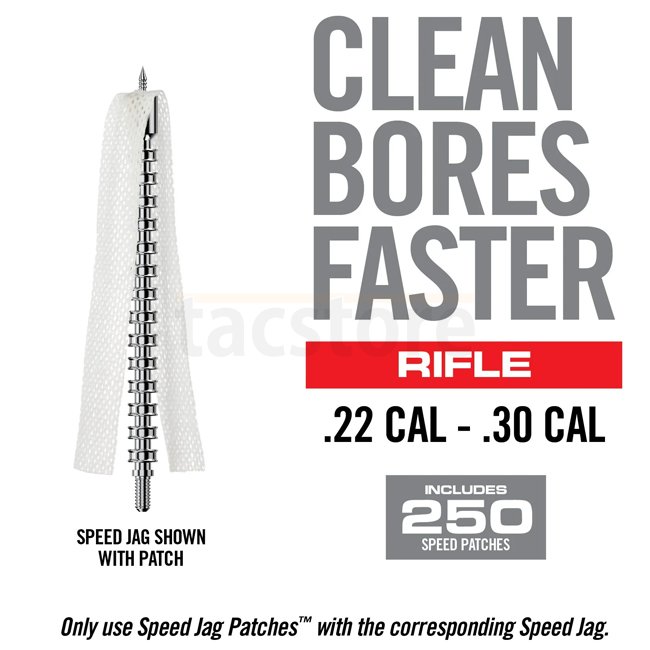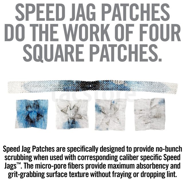 Speed Jag Patches are specifically designed to provide no-bunch scrubbing when used with corresponding caliber specific Speed Jags. The micro-pore fibers provide maximum absorbency and grit-grabbing surface texture without fraying or dropping lint. Speed Jag Patch Refill Packs come in a reusable, organized storage tray with lid for convenient storage and packability.