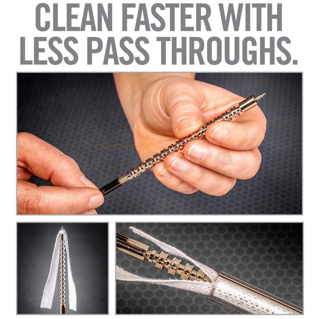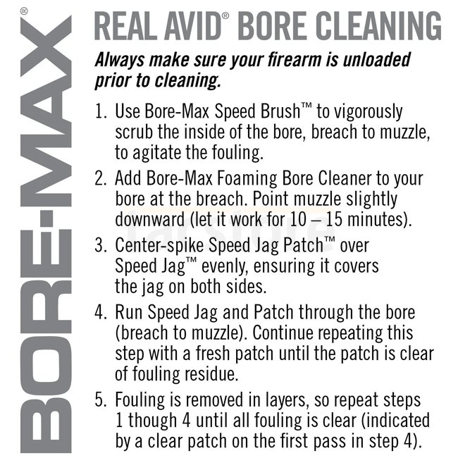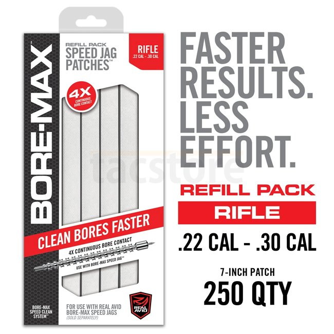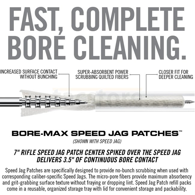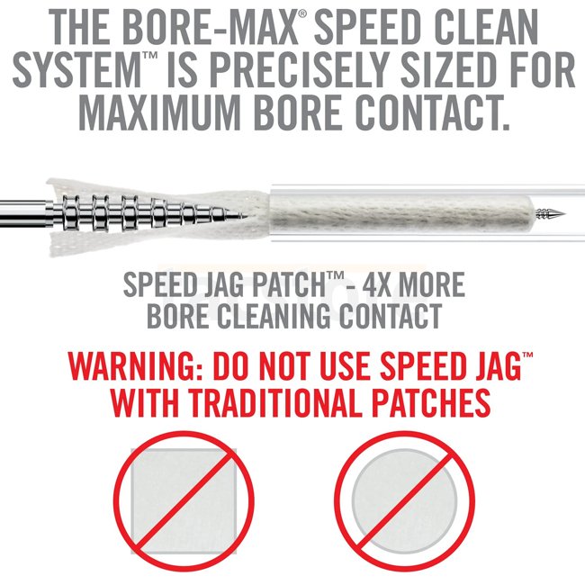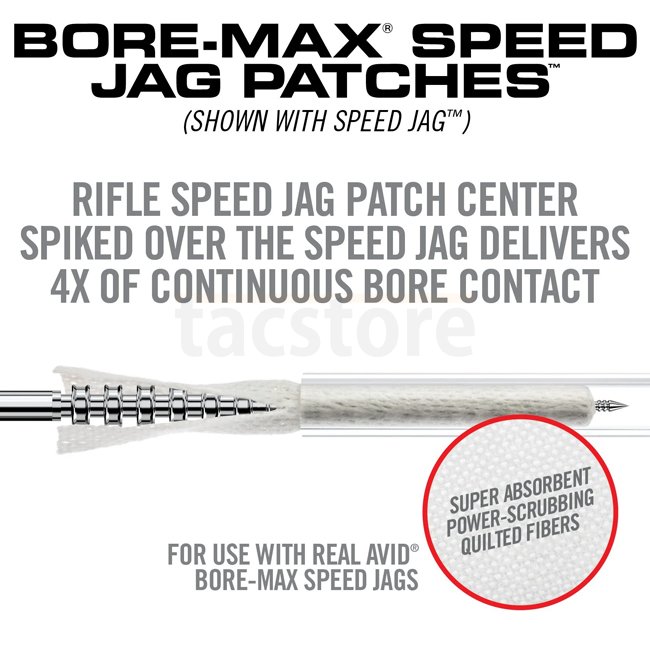 Bore-Max Speed Jag Patches are a component of the Bore-Max Speed Clean System for faster and easier bore cleaning. Sized to account precisely for both the jag diameter and patch thickness, this combo provides the optimal compression to thoroughly and consistently reach into the lands and grooves. Tight enough to provide superior compression within the bore while still remaining relatively easy to push through. Speed Jag and Patch system gets more patch material in the bore, eliminates bunching and maximizes the effectiveness of each pass-through. Speed Patches are a synthetic material that that has shown superior absorbency over cotton and is better at absorbing fouling and spent solvent in the bore. The quilt-like textured surface is more effective at picking up and trapping crud as it passes through the bore without fraying or dropping lint.