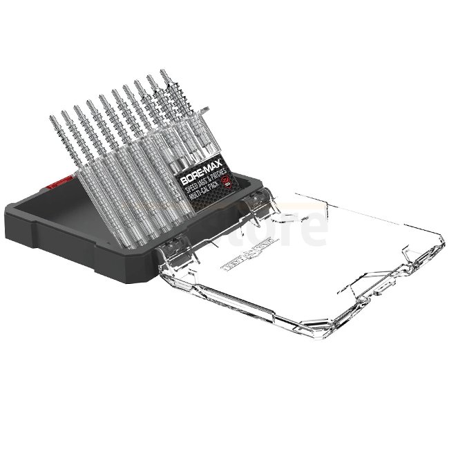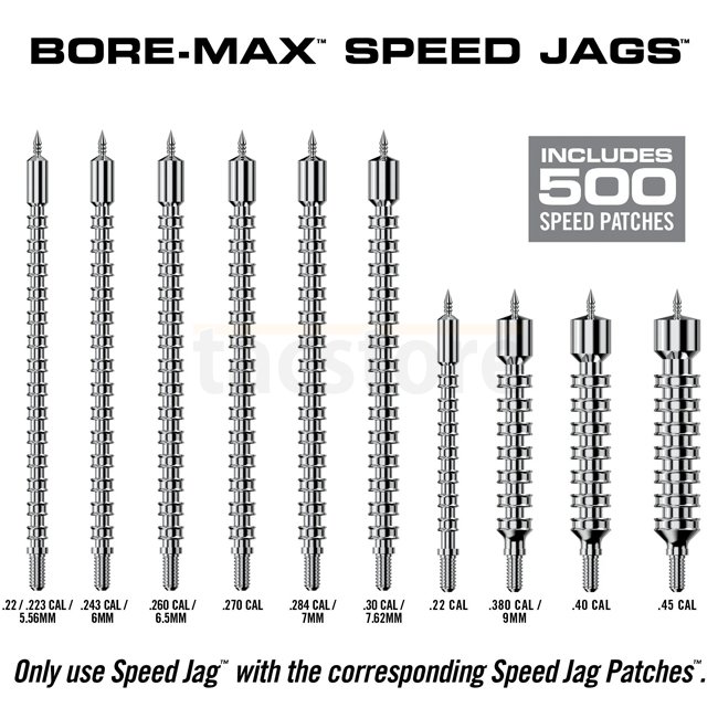 The Bore-Max Speed Jag and Speed Jag Patches Multi-Cal Pack includes 10 popular pistol and rifle calibers in one convenient storage case. Speed Jags and Speed Jag Patches are sized for precise bore fitment and optimal cleaning. The 4X greater bore contact delivers a cleaner bore faster, allowing more time at the range.