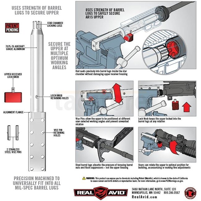 The Real Avid Lug-Lok Upper Vise Block is designed to securely hold your AR15 upper in a bench vise using barrel lugs inside the star chamber. Precision machined for Mil-Spec uppers, it allows for easy rotation and multiple working angles with 2 vise pins