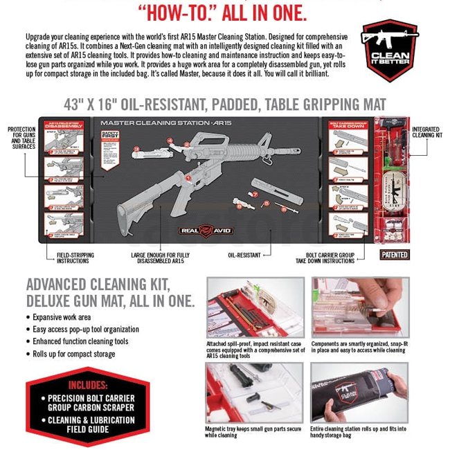 Introducing the world's first Master Cleaning Stations. Designed to empower gun owners to thoroughly clean their entire guns from bore, breech and action down to the component level. The case provides frustration free, spill-proof storage and features a proprietary pop-up storage riser making every tool easy to extract and return to its fitted holder. It ingeniously organizes a comprehensive set of gun specific cleaning tools that are locked in place, clearly labeled, easy to access and rattle free. A magnetic parts tray keeps small gun parts from getting lost during cleaning. Finally, an integrated oil resistant, no-slip backed, padded cleaning mat provides a large, safe, anywhere-anytime cleaning surface. The entire expansive Master Cleaning Station rolls up and fits into a compact storage bag. |