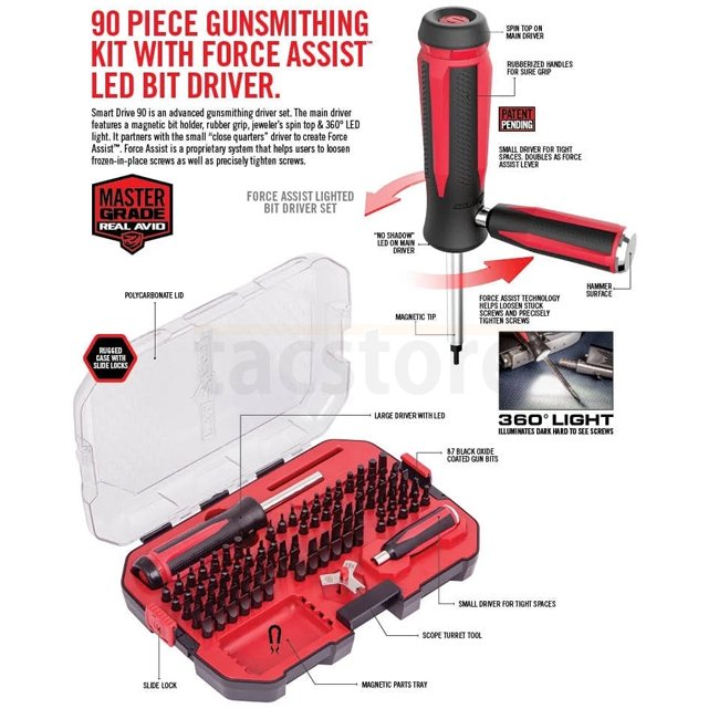 A top-notch gunsmithing driver set, Real Avid Smart Drive 90 boasts a magnetic bit holder, rubber grip, jeweler's spin top, and 360° LED light. Collaborating with the "close quarters" driver, it forms the Force Assist system to effortlessly tackle stubbor