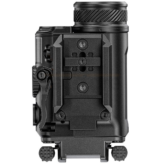 A toggle switch system provides clear mode selection: forward tap for momentary on, up/down toggle for constant mode. A tool-free latch simplifies mounting on a wider range of rails. A hidden indicator illuminates when IR is active. Power is supplied by either a common CR123A or a rechargeable 16340 Li-ion battery.