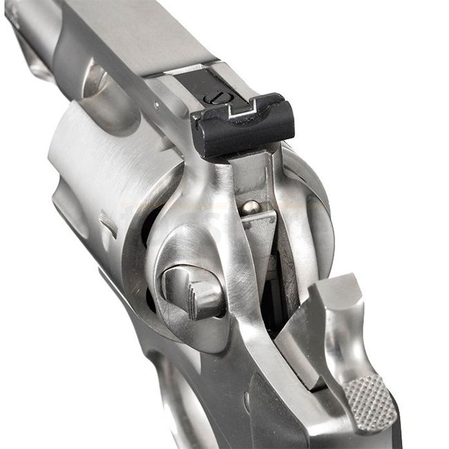 This model is dual chambered to accept both .44 Remington Magnum and .44 Special cartridges, adding versatility to its power profile.