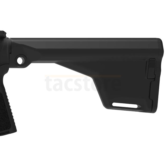 - Stock: Fixed stock with integrated spare magazine holder