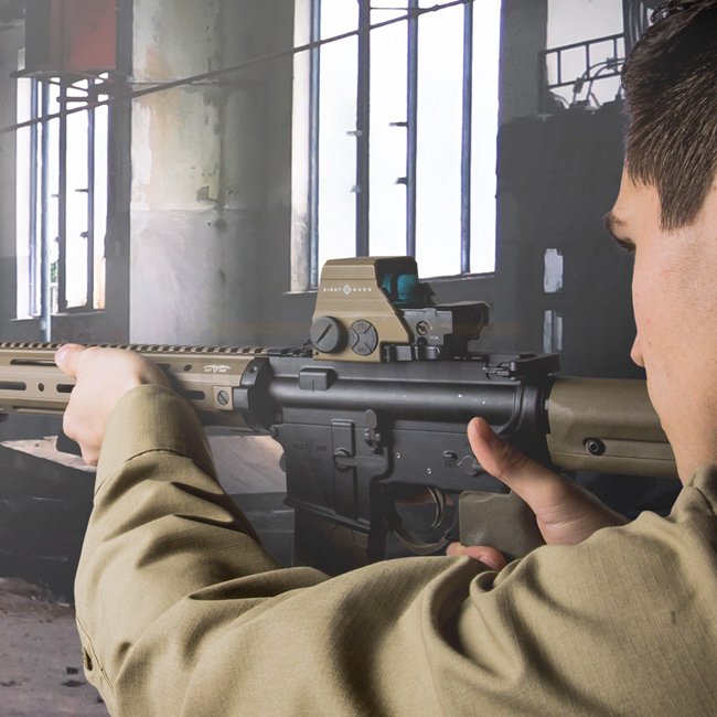The Sightmark Ultra Shot M-Spec LQD Reflex Sight in Dark Earth offers 1x magnification with a 33 x 24mm objective size. It features a 65 MOA Reddot-circle-crosshair reticle pattern with 10 brightness settings including NV mode. With a compact length of 10
