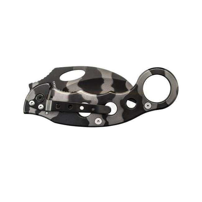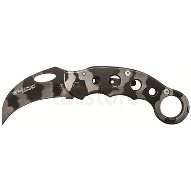This Smith & Wesson Hawkbill Urban Camo knife is a lightweight and versatile tool suitable for everyday carry. Featuring a 75 mm blade made of 400 Stainless Steel, and a handle crafted from Titanium Coated Stainless Steel, this knife offers a total length