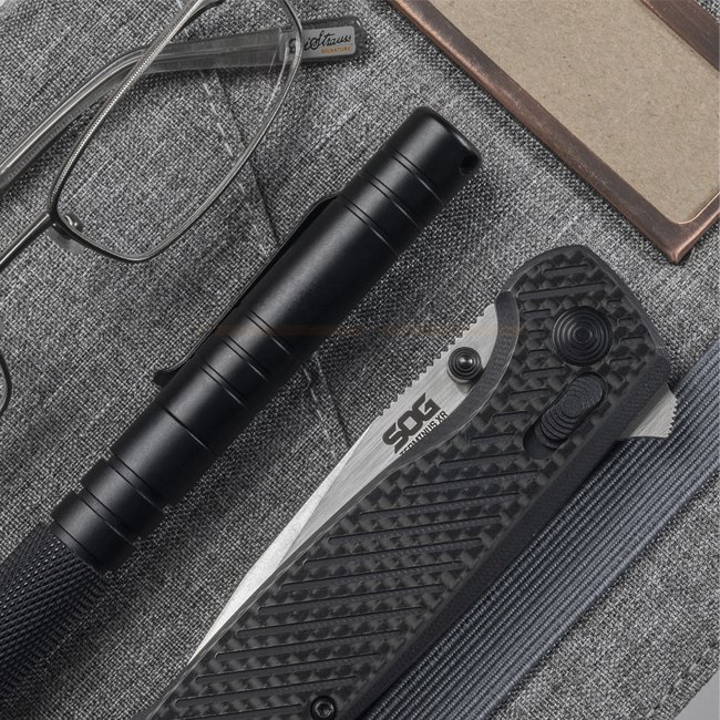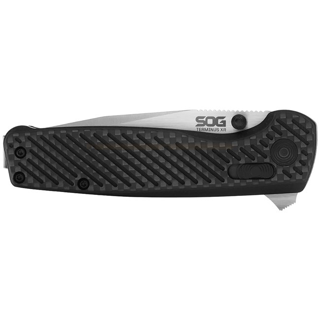 The SOG Terminus XR is a lightweight EDC pocket knife with a sturdy CPM S35VN blade, sleek G10 & carbon fiber handle, and a compact design perfect for everyday carry. It weighs only 91g and measures 1831mm in total length, with a sharp 749mm blade.