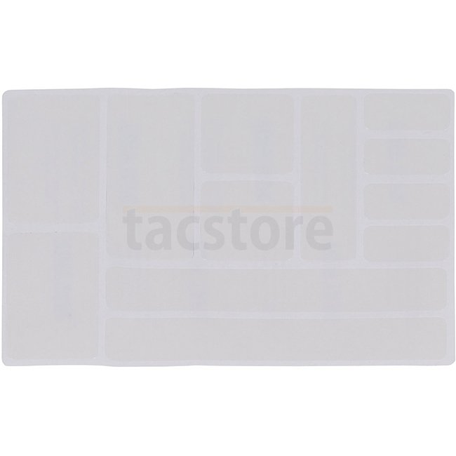 12-part set of patches for quick repair of e.g. outdoor clothing, tents, bags consists of: 4 small patches ca. 4 x 2 cm 2 square patches ca. 4,2 x 4,2 cm 2 long patches ca. 15,5 x 2,5 cm 4 rectangular patches: 2 x ca. 7 x 4,2 cm 1 x ca. 8,7 x 4 cm 1 x ca. 8,7 x 2,5 cm adheres on nearly all kinds of materials clean the damaged spot and press on the patch firmly