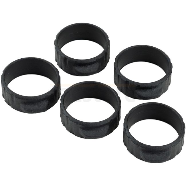 The Strike Industries Bang Band Mini - Black, a set of 5 pieces, provides enhanced grip for small objects like pistol grips and magazines. Made of heat-resistant Nitrile Butadiene Rubber, with anti-slip texture for better handling. Diameter: 34mm.