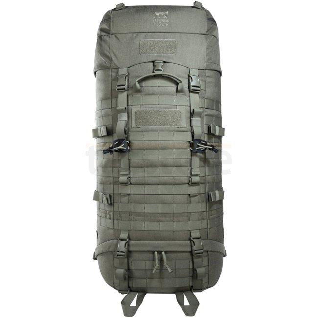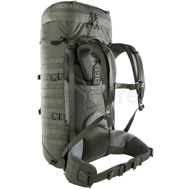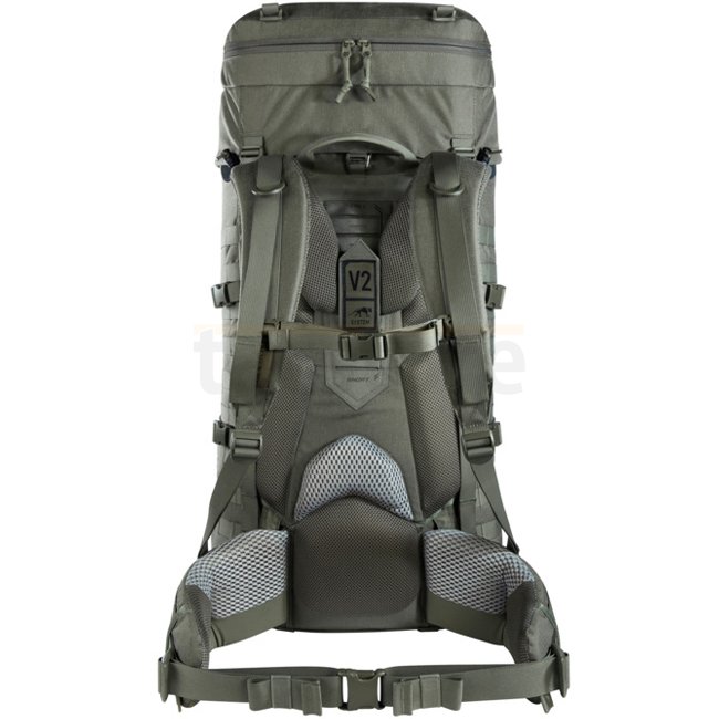 Tasmanian Tiger Base Pack 75 IRR - Stone Grey Olive backpack offers 75L volume, expandable to 90L. Features V2 Carrying System, preformed head cavity, divided compartments, gear loops, and more. Made from CORDURA® 700D IRR. Weighs 3120g. Dimensions: 77 x