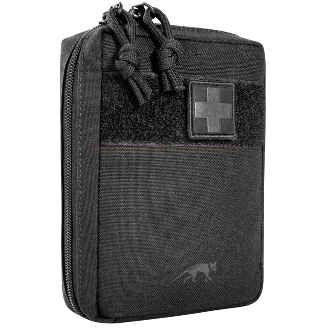 Filled first-aid kit for daily use and one person, attached with MOLLE. Features handle, zip, divided compartment, wound dressings, bandage pack, plasters, gloves, rescue blanket, and MOLLE reverse system. Material: CORDURA® 700D. Weight: 260g. Dimensions