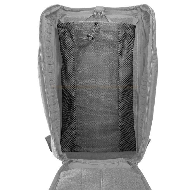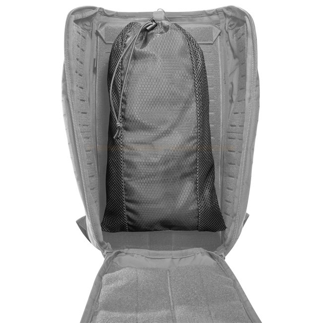 The mesh bag with transparent front and a hook hook-and-loop surface on the back can be attached to fleece hook-and-loop surfaces or in the modular TT backpacks. It is particularly suitable for clothing.