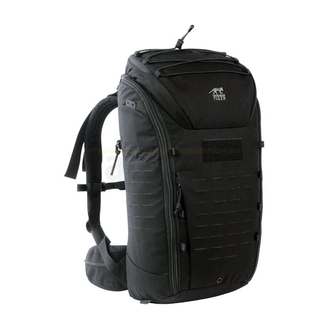 Tasmanian Tiger Modular Pack 30 - Black: Modular universal combat backpack with lid pocket, laser-cut MOLLE, Velcro sections, detachable hip fins, and accessories pouches.