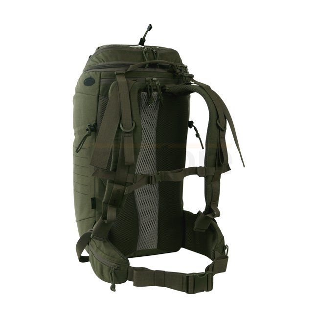 Tasmanian Tiger Modular Pack 30 - Olive. Modular universal combat backpack. Lid pocket and laser-cut MOLLE on sides and front. Front opening pulls up completely. Velcro sections for individual features. Detachable hip fins. Comes with accessories pouches