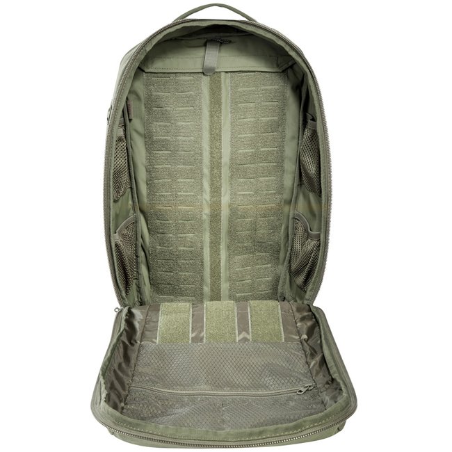 The Tasmanian Tiger Modular Tac Pack 28 in Olive is a versatile backpack with a 28L volume, perfect for carrying heavy gear. It features reinforced back system with a PE plate and aluminum rail, preparation for attaching Molle Hip Belt, expandable main co