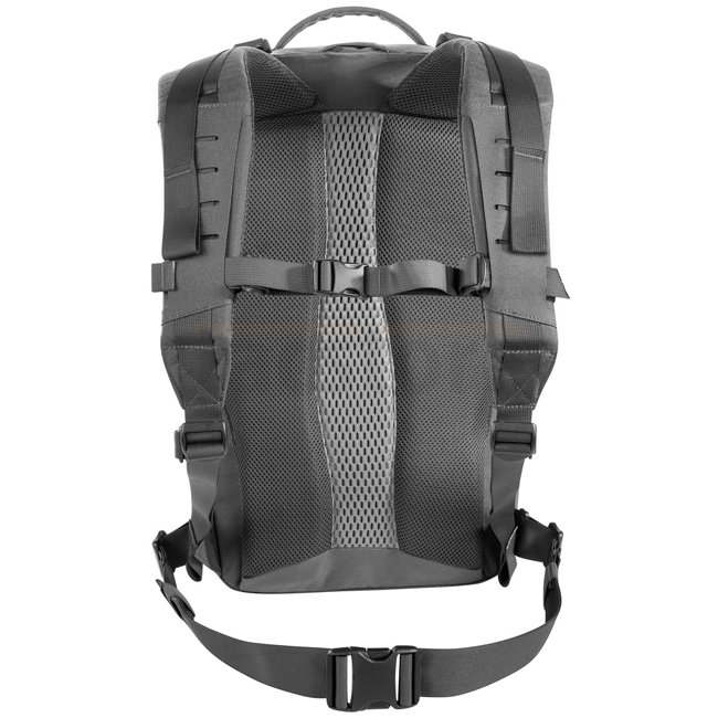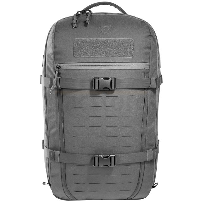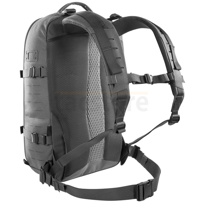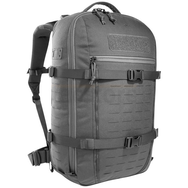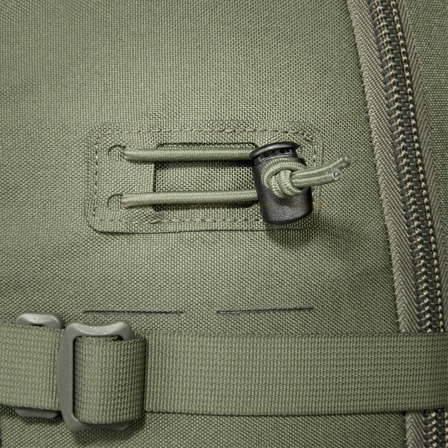 The TT Modular Tac Pack 28 is also suitable for loading more weight due to the reinforcement of the back system with a PE plate and an aluminum rail. For this purpose, it also has a preparation for attaching the sturdy TT Molle Hip Belt (a simple webbing hip belt is included). The backpack features a fully expandable main compartment with shallow mesh pockets, four small mesh side pockets, and MOLLE hook-and-loop areas for customization. The MOLLE system on the front pocket and sides can be used to attach additional gear. There is also an attachment option for tripods or poles. Two completely circumferential compression straps are used for volume adjustment.