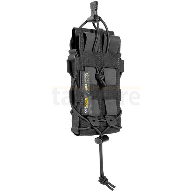 Tasmanian Tiger SGL Modular Mag Pouch MCL - Black is a versatile multi-caliber magazine pouch made of durable CORDURA® 700D material. It weighs only 120g and measures 7.5 x 15 x 2cm. Ideal for both pistol and long gun magazines, it features a removable di