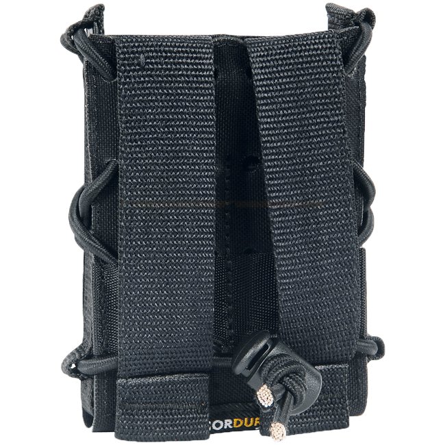Compact and versatile, the Tasmanian Tiger Single Rifle Magazine Pouch in sleek black is perfect for M4, G36 PMAG, Sig, and more. Features bungee cord with cord stopper, MOLLE reverse system, laser-cut MOLLE on the front, and requires two MOLLE loops. Ide