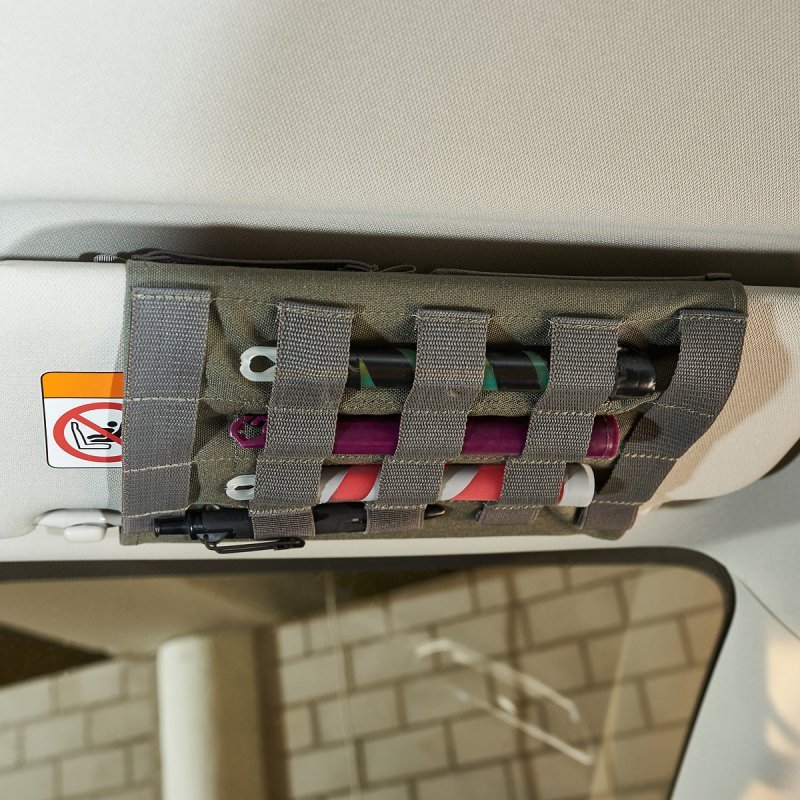 Length-adjustable MOLLE shell for attaching to vehicle sun visors. Includes ID cover. Part of the TacVec series.