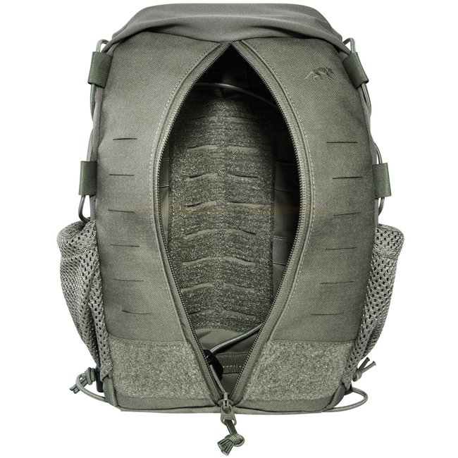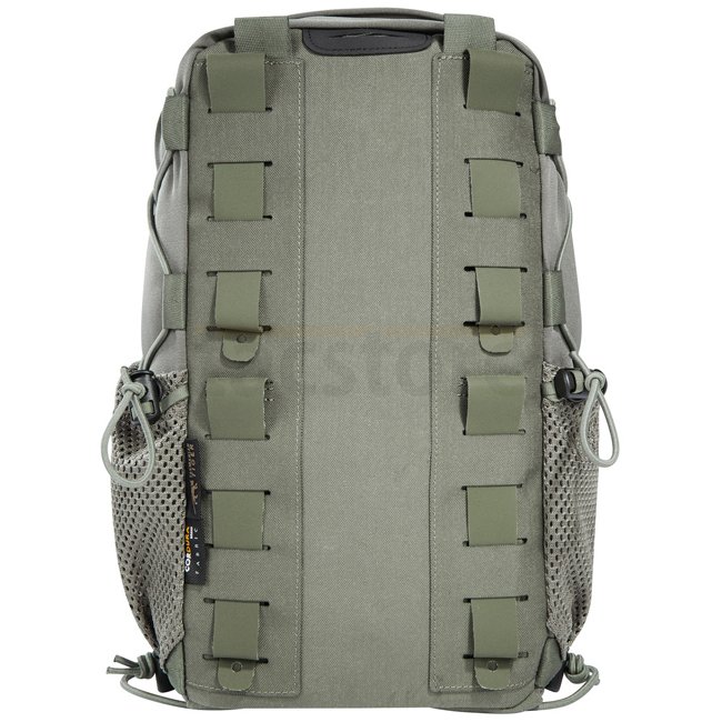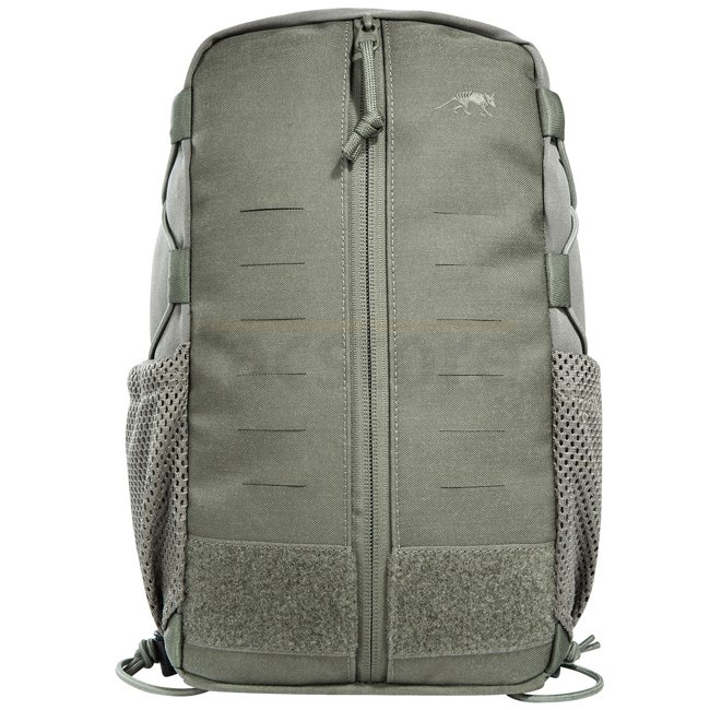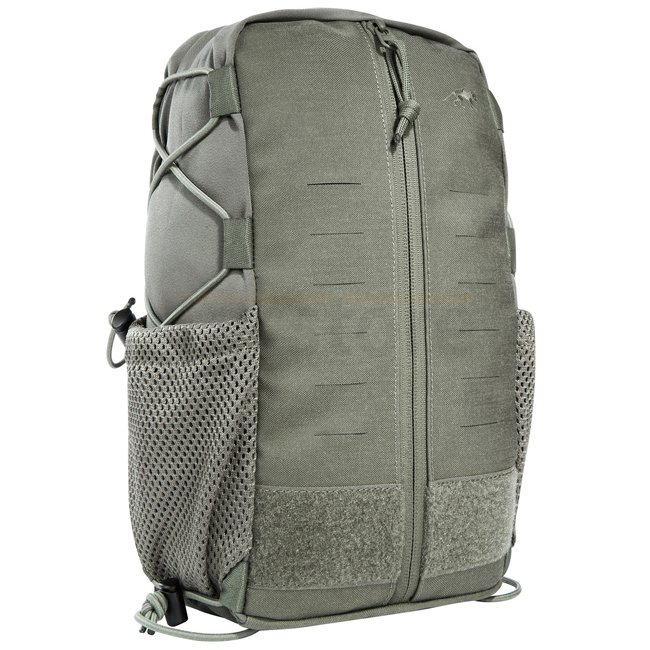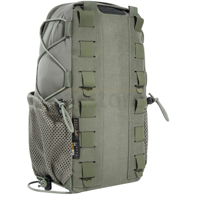 Tasmanian Tiger Tac Pouch 11 MK II IRR - Stone Grey Olive provides quick access with 7 liters volume. Features MOLLE hook-and-loop, bungee cord for medical equipment, mesh side pockets, laser-cut MOLLE design, and hydration system preparation. Compresses