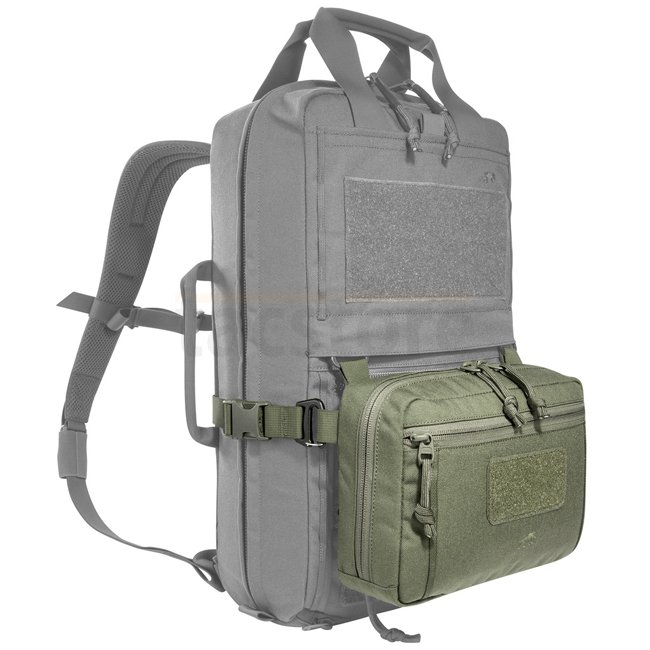 The bag has a removable MOLLE reverse system for attachment to plate carriers and backpacks. In addition, it can be hooked with loops to the TT Survival Pack or other MOLLE surfaces with appropriate buckles. There is also a pass-through for a 50mm belt loop. Inside are flat mesh pockets, elastic loops and a large MOLLE hook-and-loop surface.
