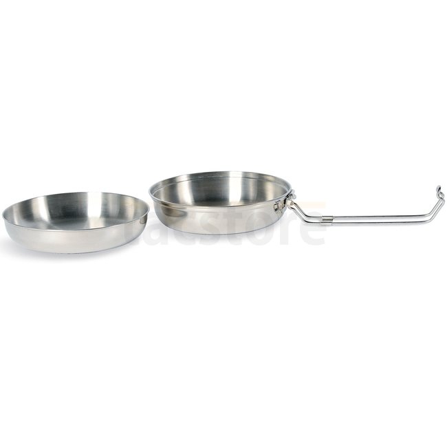 Two-piece stainless steel cooking set, Tatonka Scout Set 1.0l, that can be used as pot, bowl, and plate. Food safe, easy to clean, and unbreakable. Includes clamp lock, 1.0 liter pot, bowl, plate. Dimensions: 18.5 x 18.5 x 7 cm. Volume: 1.0 l. Weight: 260