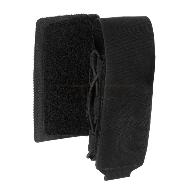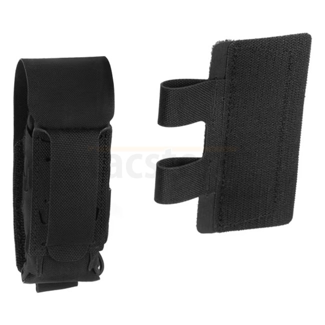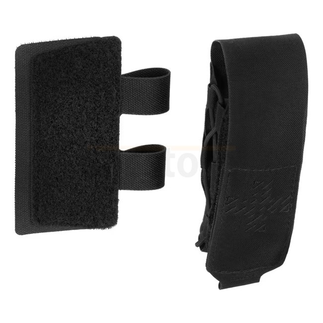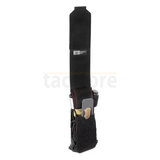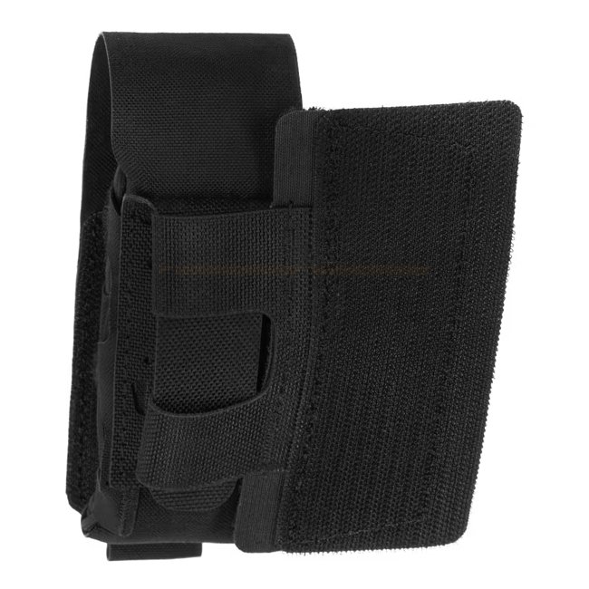The TG-TP Tourniquet Pouch is designed to securely hold a tourniquet while allowing quick access when needed. It can be easily mounted to belts or vests using a velcro adapter, with the flexibility to attach it vertically or horizontally based on user preference.