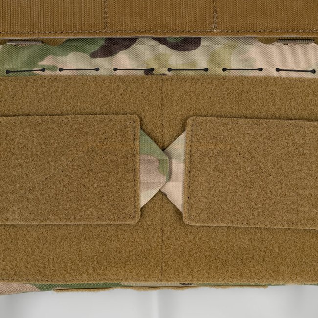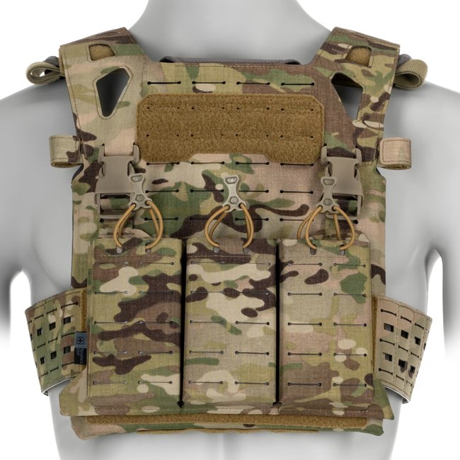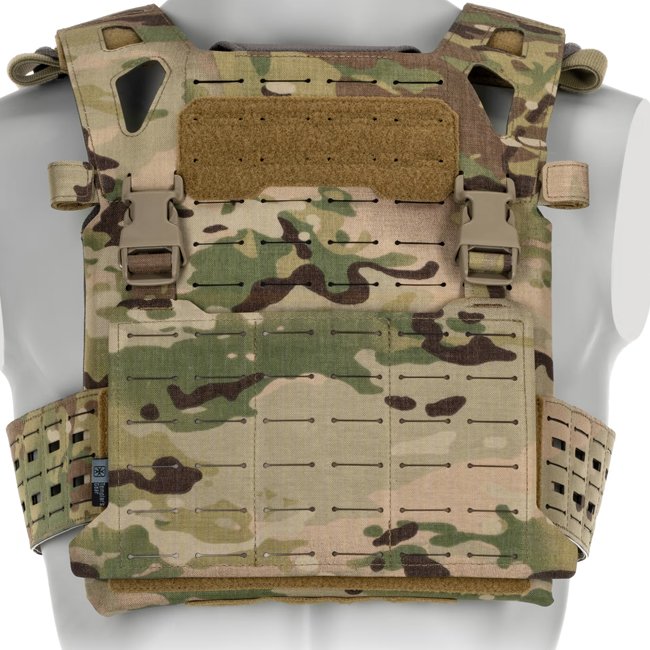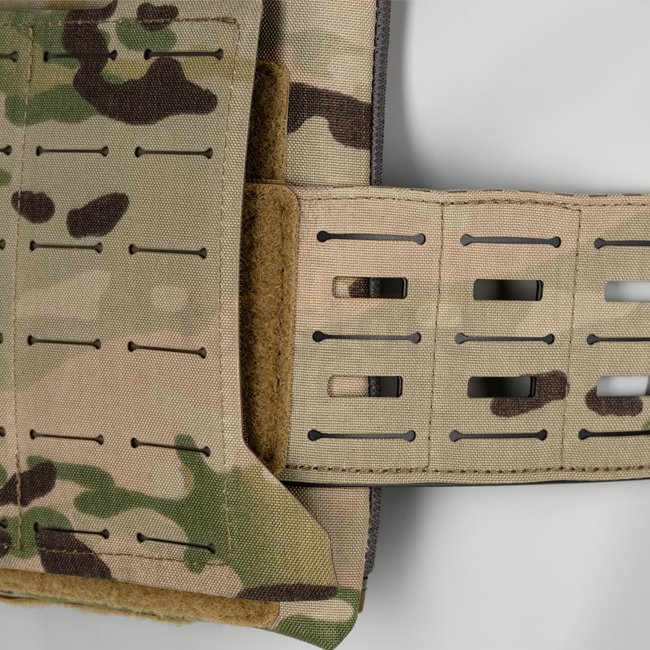 The plate carrier features padded shoulder straps for enhanced comfort and adjustable fit. Laser-cut technology significantly reduces weight without compromising functionality.