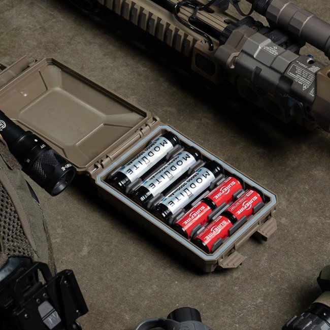 THYRM CellVault-5M Modular Battery Storage - Orange. Waterproof, modular design for various battery sizes. Integrated straps for MOLLE attachment. Durable polymer construction.
