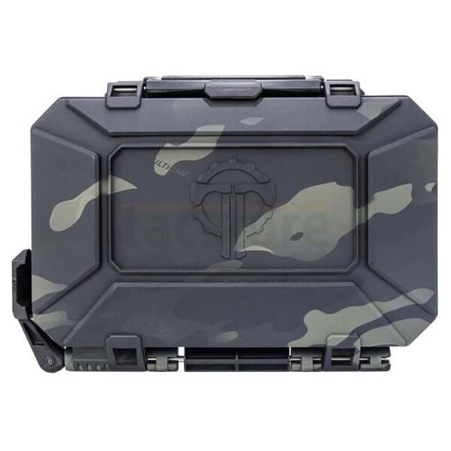 THYRM DarkVault Critical Gear Case Comms Non-Blocking - Multicam Black: Solid, battlefield-grade waterproof case with MOLLE attachment, tunable hinge, lock holes, and Velcro panels for ID and organization.