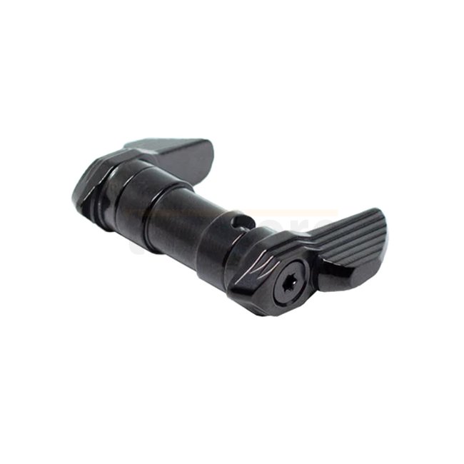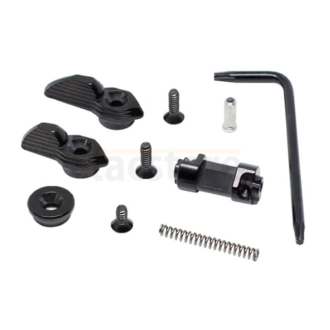 The AR Safety was developed to maximize the performance with TriggerTechs AR triggers and loaded with features. The patented design allows the safety to be installed and removed without removing the grip (after initial install). This is made possible by the tumbler and ball tipped detent pin. This feature saves time when changing triggers, cleaning or performing maintenance on your firearm. The detent has a silicon nitride ball tip which offers extremely low friction and durability, which gives an unmatched smooth feel when changing from safe to fire. The same material used on the bottom of space shuttles! The safety is ambidextrous with interchangeable short and long levers. A cap is provided to install on one side if the user wishes to only have a lever on one side. It can easily be setup as a 45 or 90 degree throw. The tumbler is made of 440C stainless steel and DLC coated for ultra performance and durability. The levers are constructed from 17-4 stainless steel and the black version is coated with PVD. This product is a must have for any competitive shooter looking to up their game!