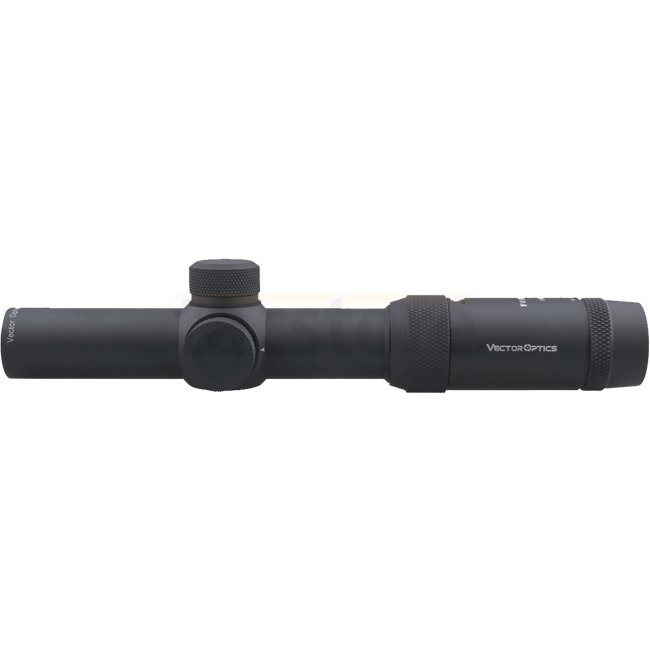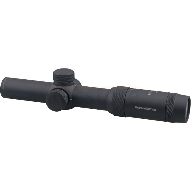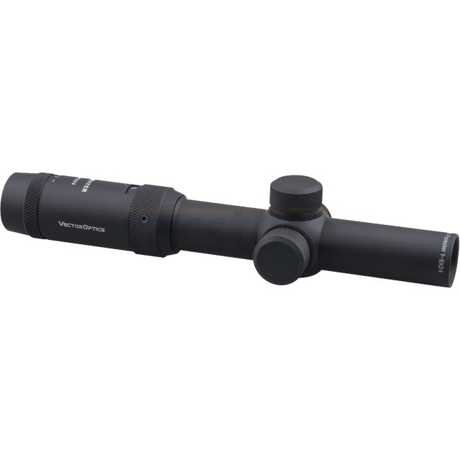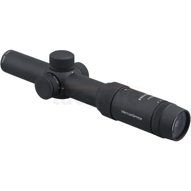 This Vector Optics Forester 1-5x24 Riflescope in black offers magnification ranging from 1-5x with a 24mm objective lens diameter. It has an eye relief of 115-95mm and a field of view from 22.3-6.1m. The riflescope features a 30mm tube size, VFD-2 reticle