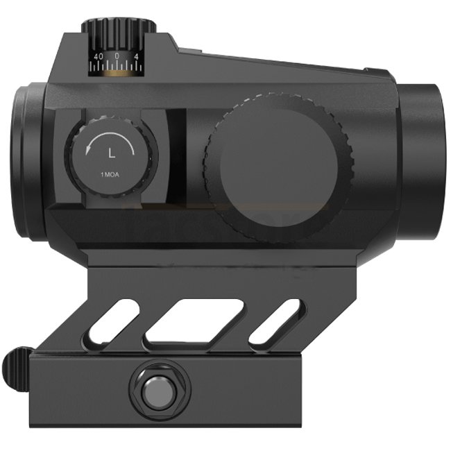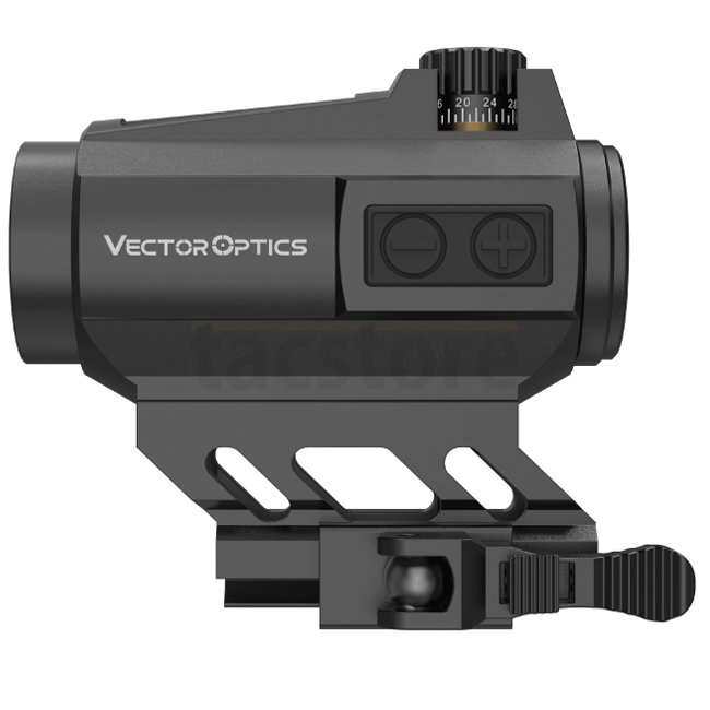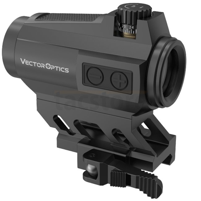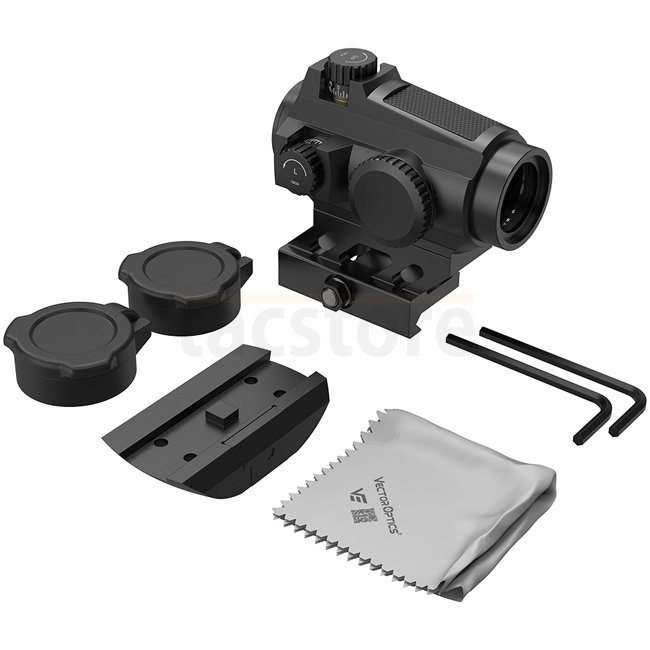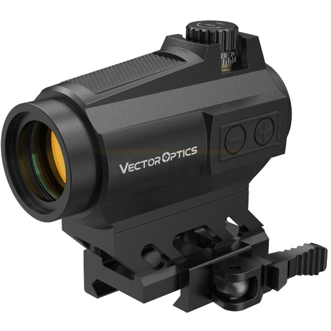 Compact and lightweight red dot sight by Vector Optics. Features 1x magnification, 22mm objective lens, unlimited eye relief, 2 MOA red dot reticle, 7 daylight & 1 night vision brightness levels, 1 MOA adjustment graduation, and CR2032 battery. Ideal for