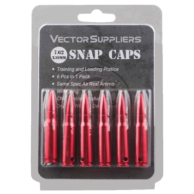 Enhance your shooting skills with Vector Optics Practice Loading & Training Dummy Rounds in 7.62x39mm caliber. Set of 6 pieces made from durable aluminum with soft silicon primers.
