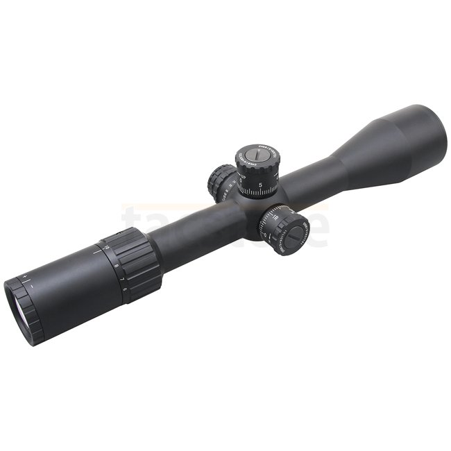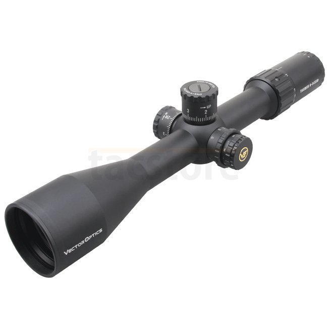 The Vector Optics Taurus 6-24x50 HD MPX1 SFP Riflescope in black offers 6-24x magnification, 50mm objective lens diameter, and 100mm eye relief. It features an etched glass MPX1 reticle, 30mm tube size, and 0.1 MRAD adjustment graduation. With a second fo